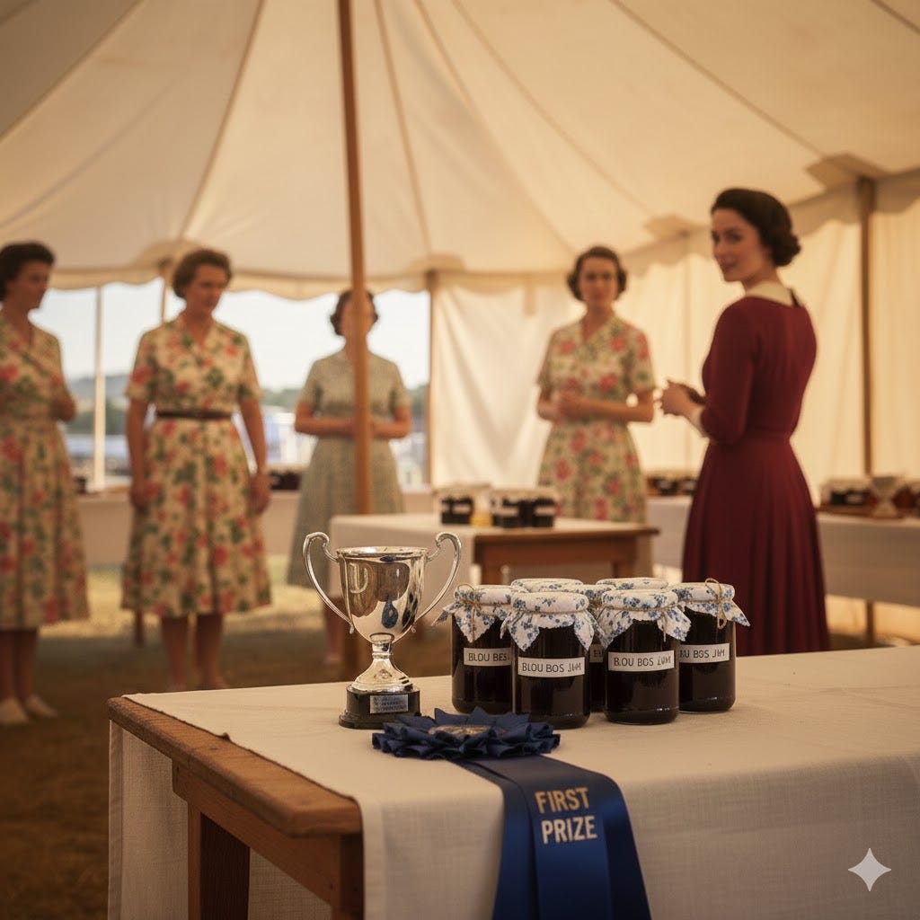 The tent was impressive. Tables stood along the outer edge, giving space for the public to move and admire. Sonja felt a lift in her chest. Their table was the first on the right - exactly as planned. Today marked her first entry into the Landbou Unie Best in Show Competition - her jam from Lindiwe’s family. She felt confident and felt a swell of pride. This meant everything to her. Failure was not on the cards today.