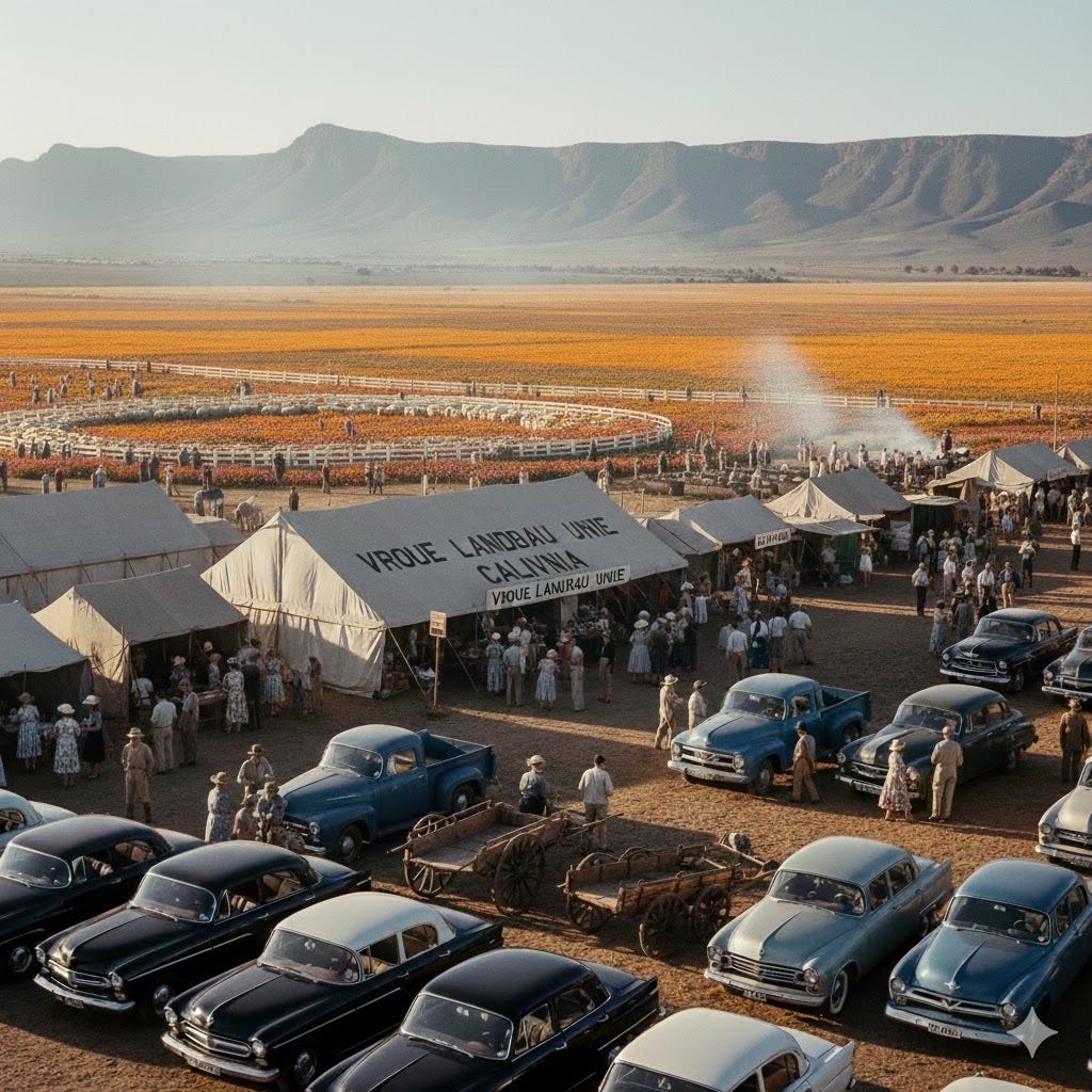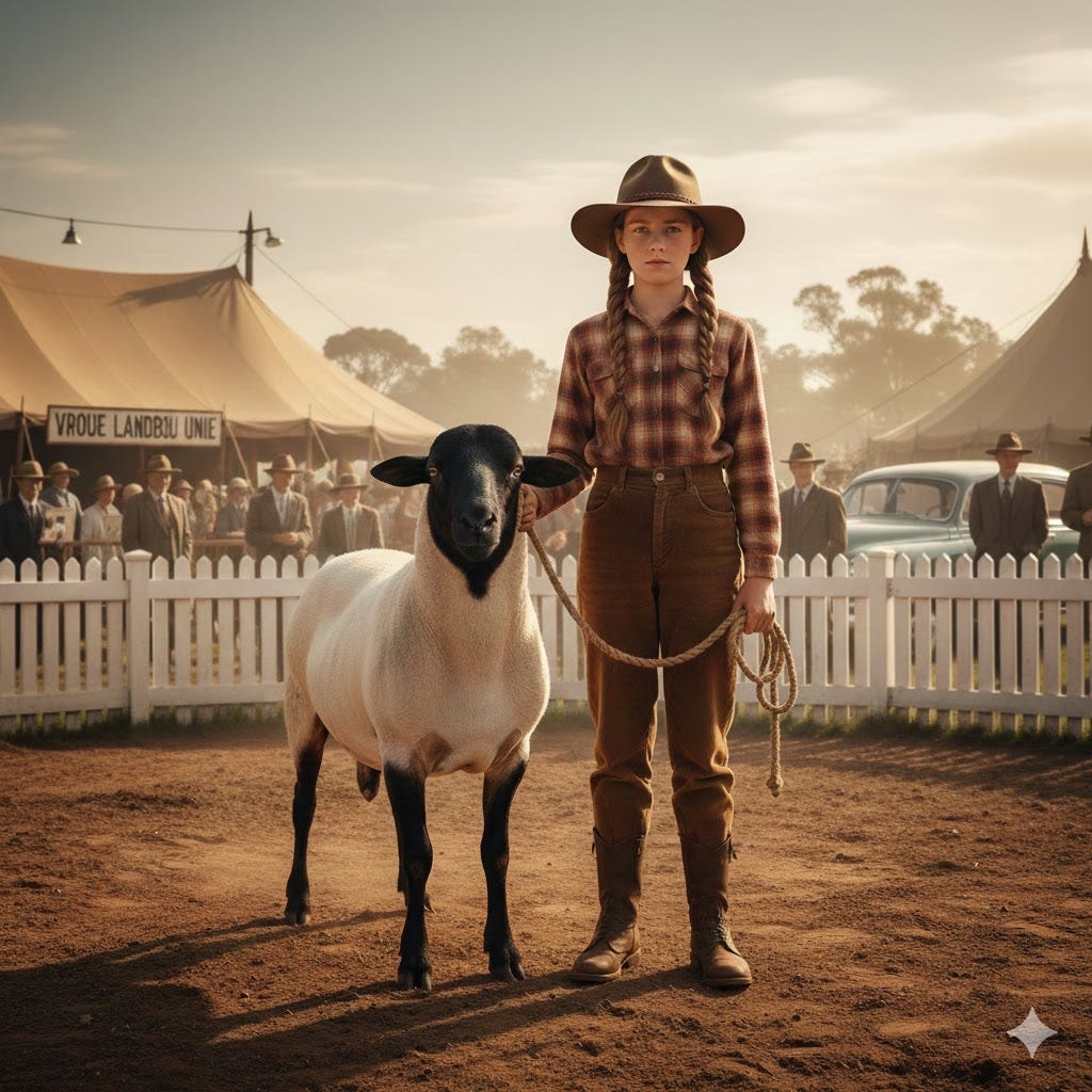 Sheep pens stood freshly whitewashed, chalkboards listing breeds and weights. Dorper, Merino, Persian. Men moved through them in pressed khaki trousers and shirts, veldskoene polished for once, hats tipped only when greeting a lady or someone of consequence. Women arrived later, dressed carefully, children in tow. The Vleisfees was not to be missed.