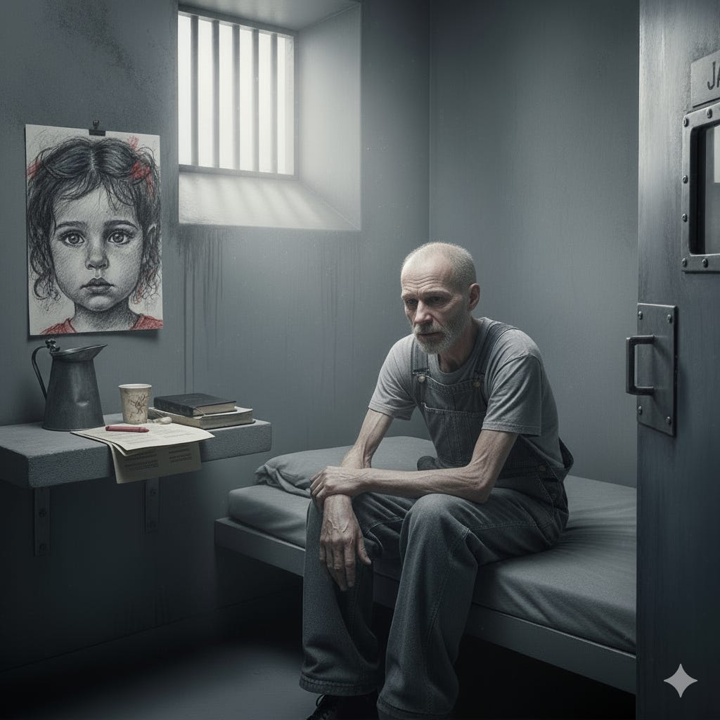 Glancing around his cell his eyes rested on the only items he was allowed to keep – a Bible, a notebook, and a black crayon. The Bible he never read, the pieces of paper glued together held some scrawls. Writing with the crayon was difficult. What he enjoyed was drawing. He glanced at his drawing of his duaghter on the wall, put the paper cup down. That night sleep did not come. It was so cold icicles formed on the ceiling in the right-hand corner of the room. Winter was cruel. His cell being on the outside of the block. There was a leak in the roof where they formed. He remembered the punishment for asking it to be repaired. The guard shoved him so hard that he hit the floor and bounced. That day forever etched in his mind when he sat down.