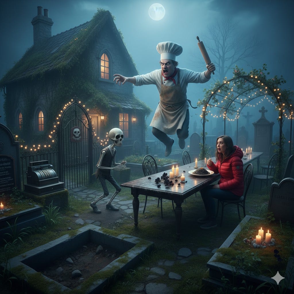 A nervous, living woman named Sarah peered through the wrought iron. She wore a bright red puffer jacket - a ridiculous contrast to the crumbling Victorian mausoleums lining the path. She was here on a dare, drawn by the ludicrous five-star review the Bistro had somehow acquired on a local dining app.