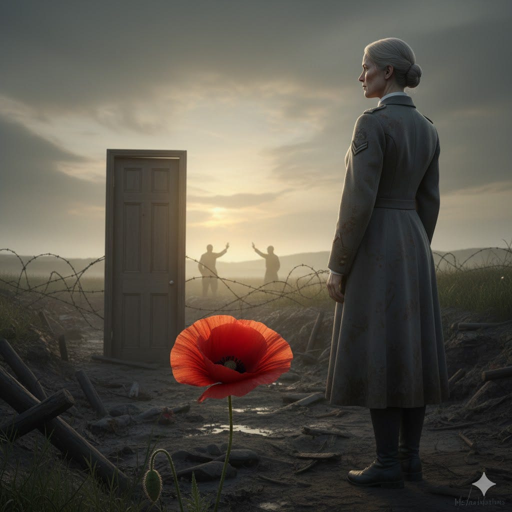 Night after night, she walked the line with a lantern, its light muffled in her cloak. She carried messages, names, pleas, half-forgotten hymns. She crossed where no one dared. Some said she was touched by madness; others said by mercy. Her soul purpose was to instil calm in the dark, dank and rotting trenches.