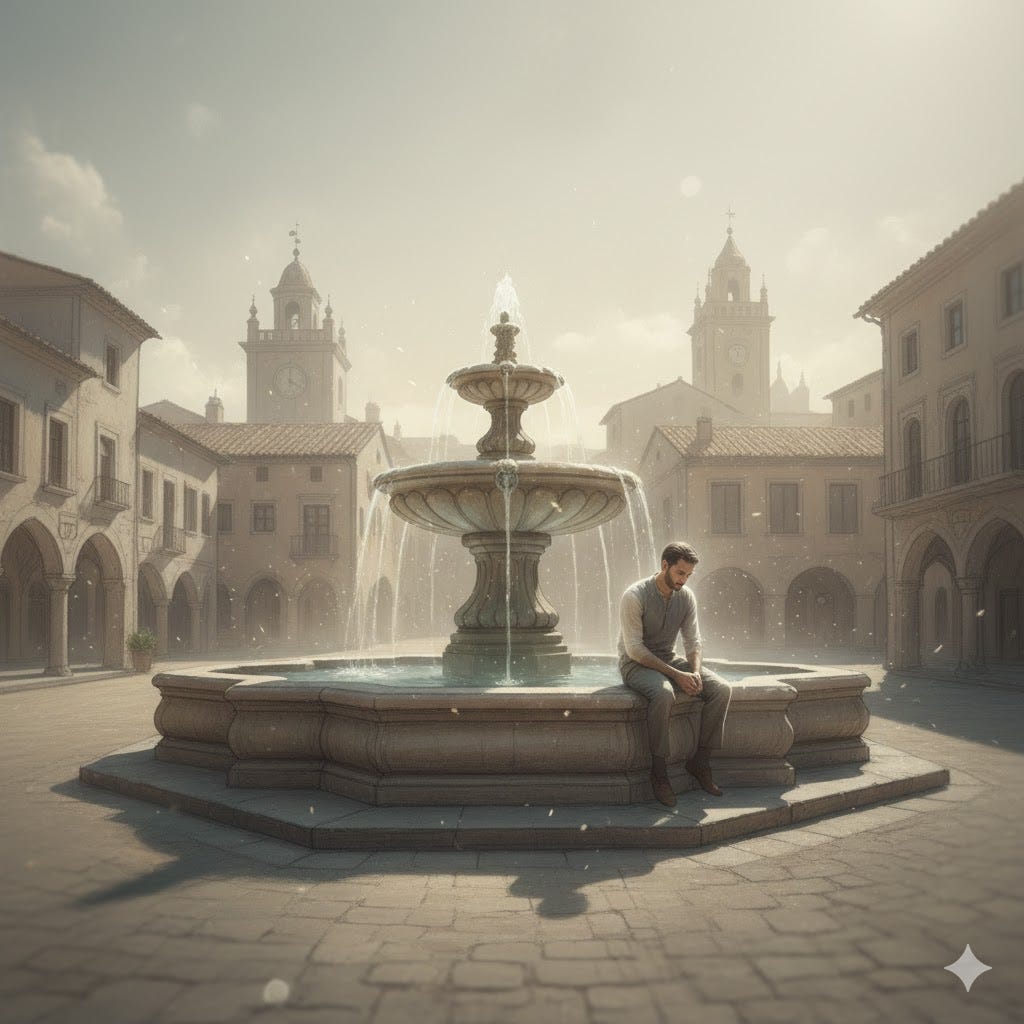He sat at the edge of the fountain that had never been fully described. The water moved as it pleased - unprompted, unmeasured, and the light that touched it came from no defined source. He was not restless. Not waiting. Not lingering with the hollow gaze of the half-written.