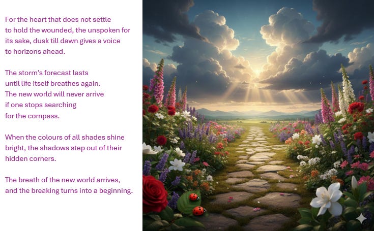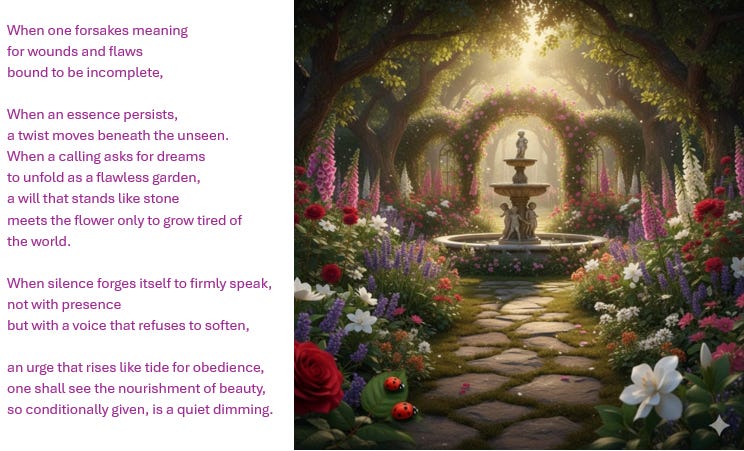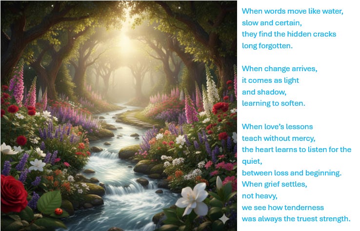 This is a gentle duel between two voices. A soft and lyrical tension where two perspectives lean towards one another and push back with tenderness. This allows the poem to hold two truths at once.